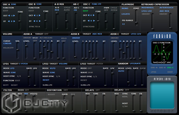 Funxion – бесплатный гибридный синтезатор в формате VST-плагина для Windows с настраиваемыми параметрами формы волны и искажения.