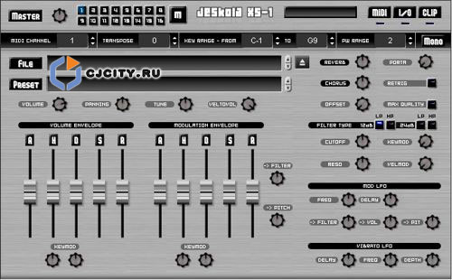 Jeskola XS-1 - простой и бесплатный сэмплер/проигрыватель, который работает с такими форматами файлов как: .XS1, .SF2 и .WAV (полная поддержка SoundFonts). Поддерживает разделение виртуальной клавиатуры на 16-ть частей, можно создавать по несколько слоев.